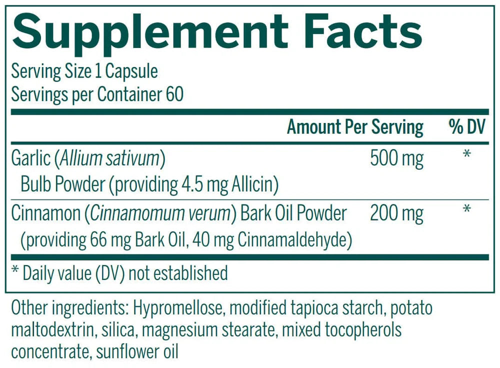 • Contains ingredients traditionally used to maintain optimal cardiovascular health and to support healthy lipid metabolism*• Provides 10 mg of allicin and 80 mg of cinnamaldehyde per day