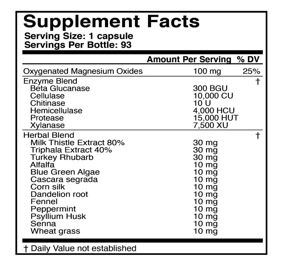 CLEANSXYM™ is a proprietary blend of oxygenated magnesium in a base of protein/carbohydrate/fiber digesting enzymes designed to facilitate the cleansing and elimination process in the lower intestinal tract.*