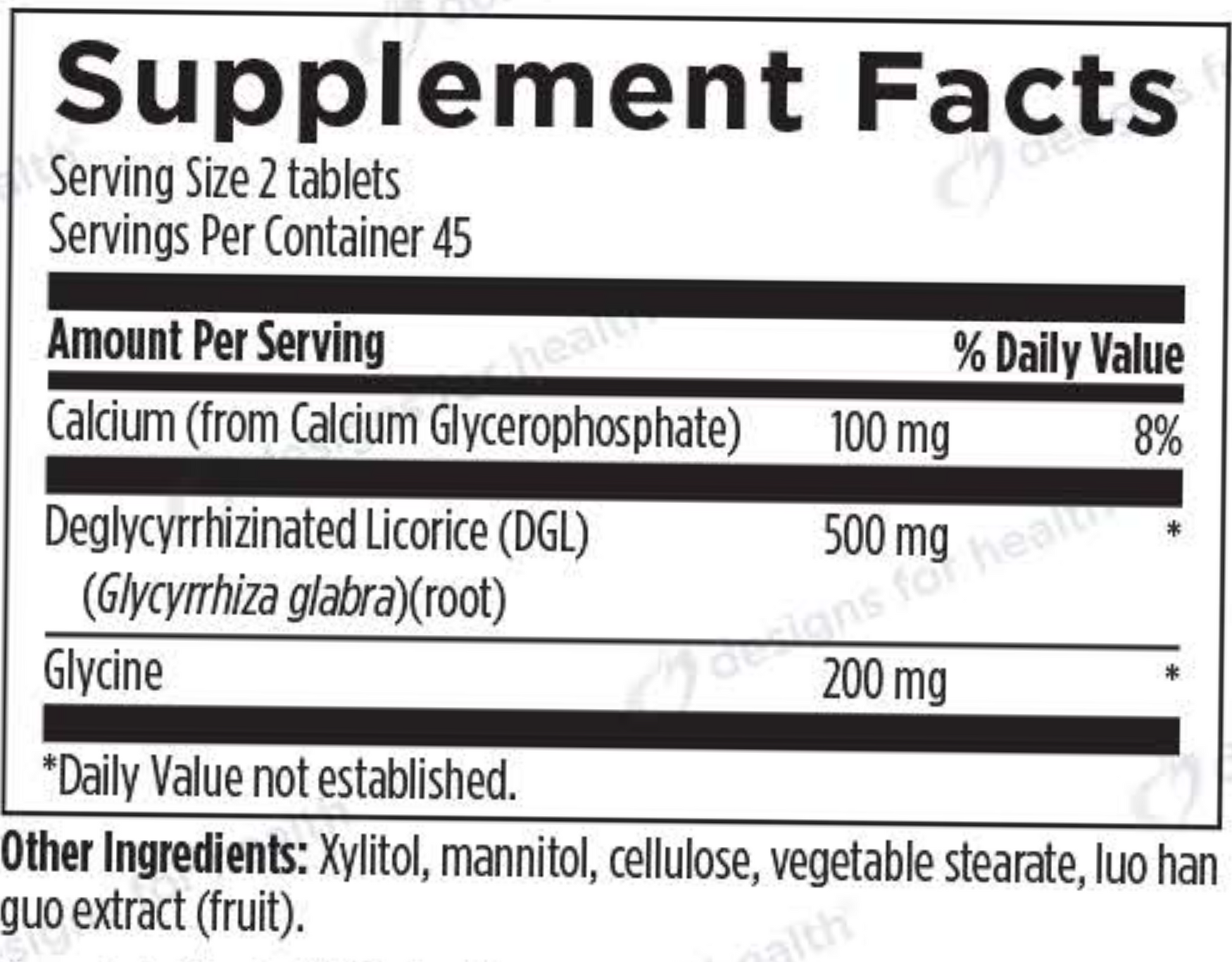 GastrointestinalDGL Synergy™ is a fast-acting, chewable formula of deglycyrrhizinated licorice (DGL) which offers support for the gastric mucosa.* It contains a standardized high-quality form of DGL, the amino acid glycine, and calcium in the form of calcium glycerophosphate.