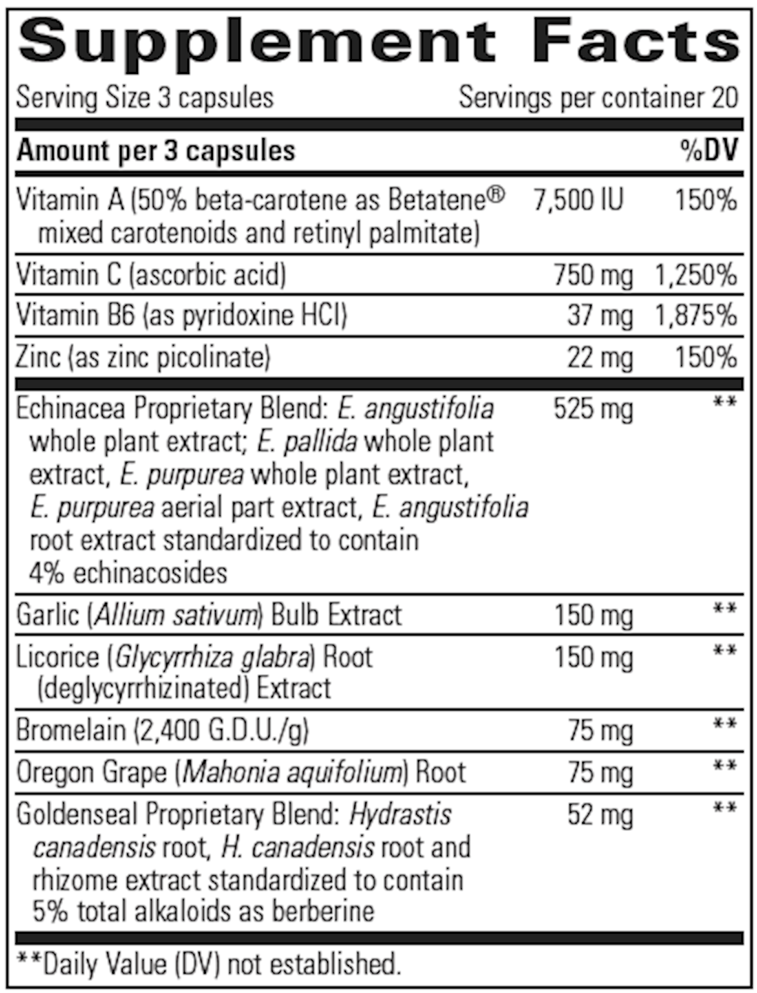 EHB (echinacosides, hydrastine, berberine) combines nutrients and herbs in a complex immune formula. EHB provides echinacosides from Echinacea and alkaloids including hydrastine, berberine, and canadine from a proprietary blend of Goldenseal and Oregon grape (Mahonia aquifolium) root. Echinacea used in EHB is from a proprietary blend of E. angustifolia, purpurea, and pallida species. Other herbs included in the formula include garlic (Allium sativum), deglycyrrhizinated licorice (Glycyrrhiza glabra) root, and ginger (Zingiber officinale) root. Vitamins A, C, B6, and zinc are included in substantive amounts.