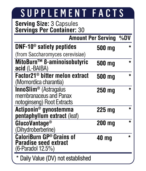 First, we have included InnoSlim®, a proprietary blend of purified, fractionated extracts of Panax notoginseng and Astragalus root produced by a pharmaceutical-grade extraction technology. Research has shown it supports the production of adiponectin, a protein hormone that helps modulate metabolic processes such as glucose regulation and fatty acid metabolism. InnoSlim® reduces glucose absorption in the intestine by 42%. This means that only 58% of the glucose you eat will be absorbed in your intestine. In addition, InnoSlim® also increases glucose absorption in muscle and fat cells by 50% and 68% by upregulating GLUT4 transporters, which takes glucose from our blood and transfers it into the muscle tissue. InnoSlim® has also been shown to support appetite control, AMPK activation, insulin resistance, triglycerides and sdLDL in cell, animal and human studies.