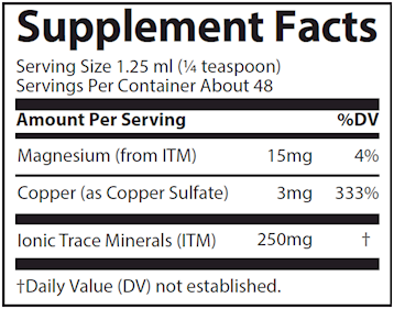 Ionic Copper provides 150% of the Daily Value of copper per serving, plus over 72 naturally occurring ionic trace minerals. Copper is an important mineral that helps to activate the antioxidant enzyme superoxide dismutase. Copper also plays an important role in many physiological processes, including the healthy formation of red blood cells, proper enzymatic reactions, efficient utilization of iron, and maintaining healthy connective tissue, hair, and eyes.*