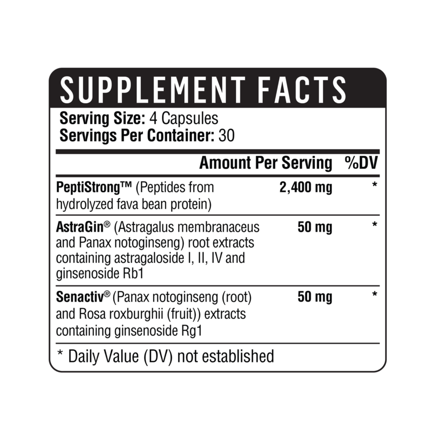 PeptiStrong™, Senactiv® and AstraGin® work synergistically to target multiple mechanisms, to provide a wide range of benefits in muscle health.