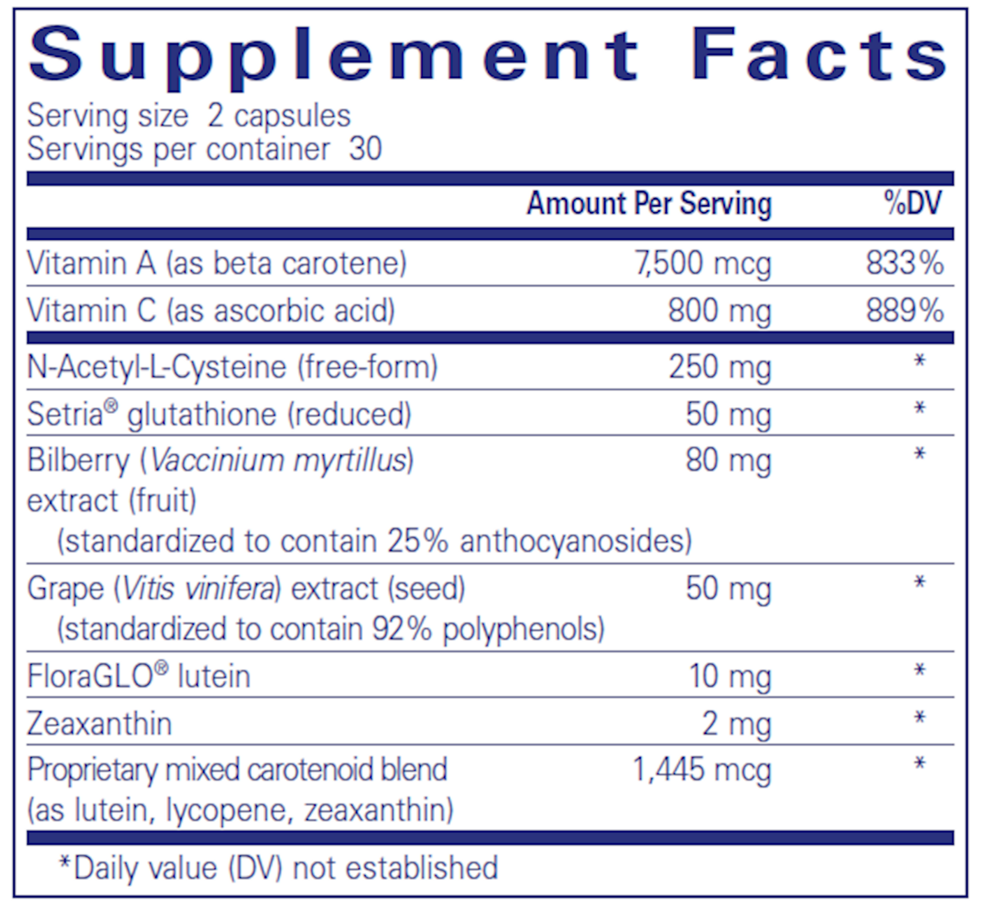 Combined with these cofactors, grape seed extract helps provide antioxidant balance in the retina. This formula is also enhanced with lutein and zeaxanthin, the only two carotenoids found in macular pigment. Lutein and zeaxanthin promote the integrity and density of the macular pigment, as well as helps maintain the health of the optical lens. The antioxidant activity of carotenoids and vitamin C provide optimal macular protection and ocular health.*