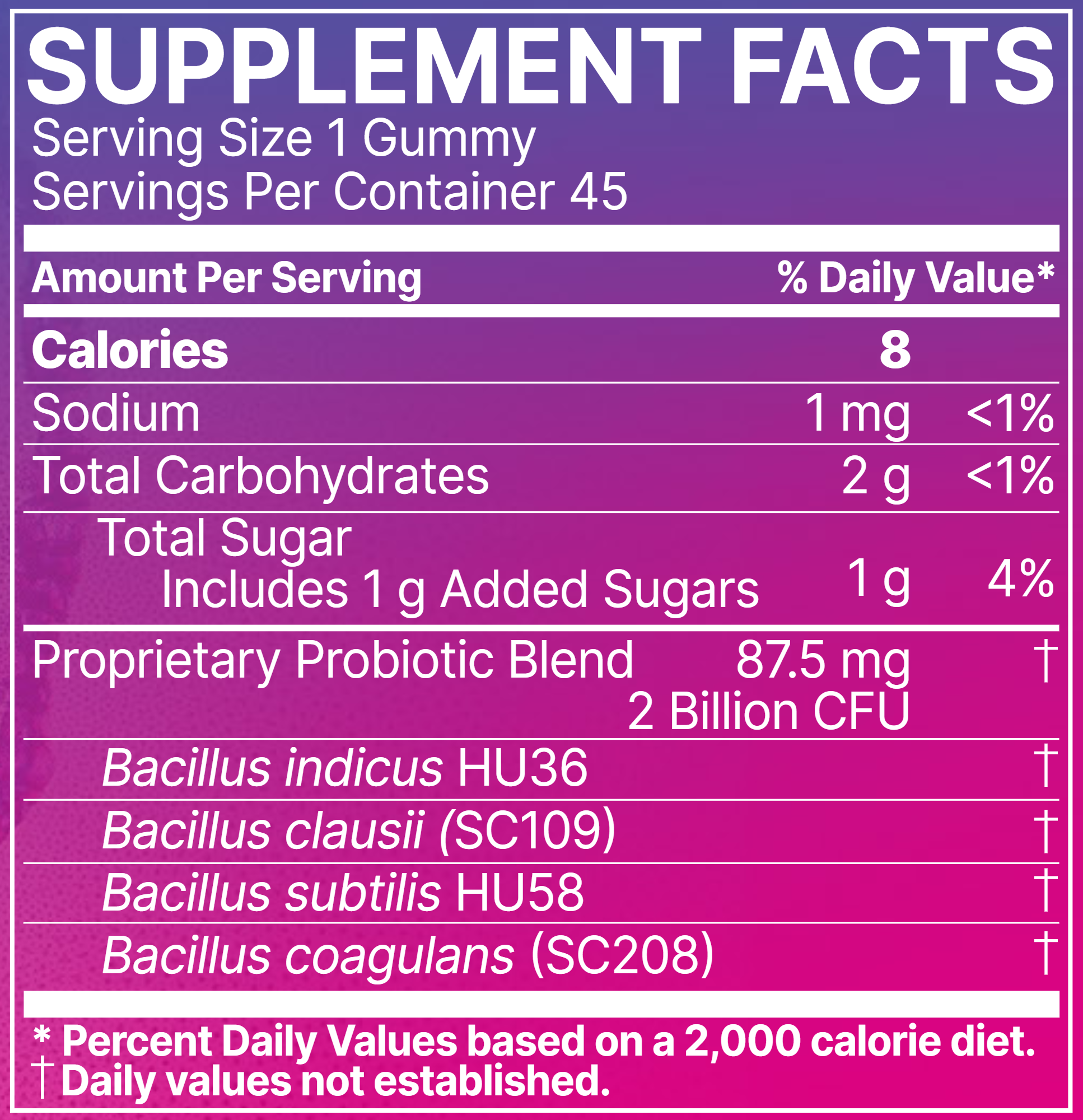 MegaSporeBiotic for Kids™ gummies contains four Bacillus spore-forming probiotic bacterial strains that are naturally designed to navigate digestion with 99.99% survivability. They arrive in the gut, transition from spore to active form, and provide a practical and functional way for the gut microbiome to receive essential daily support. MegaSporeBiotic for Kids™ probiotic gummies combines spore-based probiotics' survivability with an innovative delivery method to support gut microbiome health and simplify daily life. Convenient and easy to consume, they’re a no-fuss addition to any daily routine!