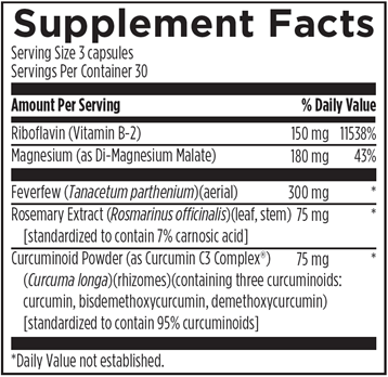 Migranol™ contains an extract of feverfew, a traditional herb that has been used since the first century and is known for its ability to support a healthy inflammatory response. Curcuminoids and rosemary are also included for their antioxidant properties as well as their role in supporting a balanced inflammatory response. Magnesium is added for its effects on muscle relaxation.*