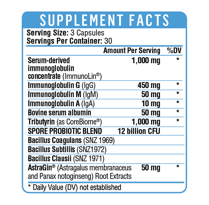 ImmunoLin® is the branded ingredient serum-derived bovine immunoglobulin/protein isolate (SBI) with over 40 human studies demonstrating its clinical efficacy in digestive and immune health. SBI has been shown to be a broad-spectrum modulator of the immune system by targeting excessive or imbalanced immunity.* In addition, ImmunoLin® works by binding, neutralizing, and removing pathogenic bacteria, viruses, and other gut irritants that can lead to inflammation.* It also helps to repair the gut lining and restore gut homeostasis.*