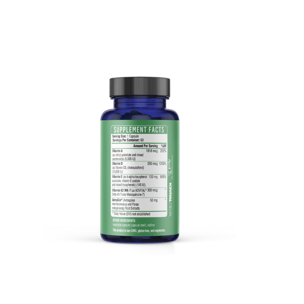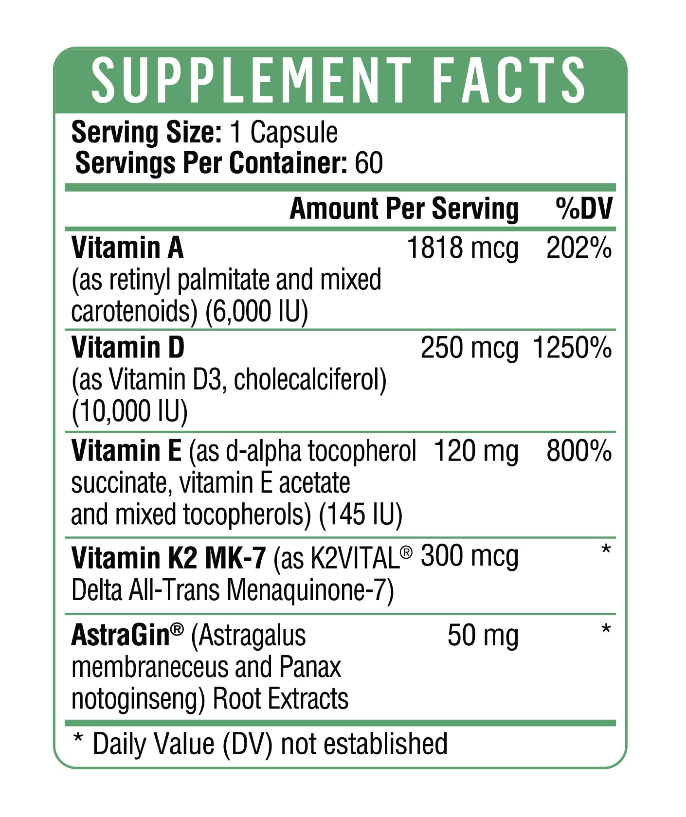 - AstraGin (astragalus membranaceus and panax notoginseng) to promote maximum absorption and delivery of fat soluble vitamins in the body