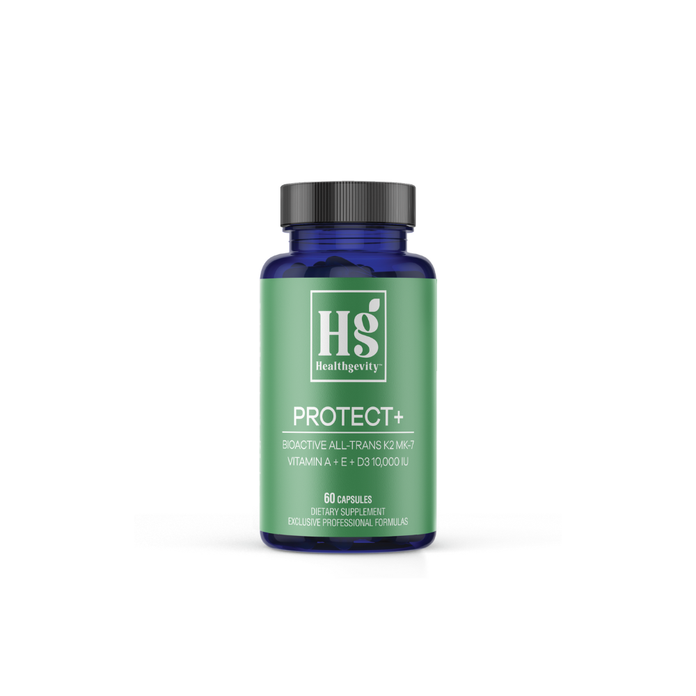 Among all of the K vitamins, vitamin K2 MK-7 exhibits the best bioavailability and longest half-life, with a half-life of 72 hours compared to two hours observed with K1. Due to its quick uptake and long half-life, K2 MK-7 reaches bones and vessel walls more easily, resulting in more effective activation of proteins, like osteocalcin. Osteocalcin proteins in the body must be activated to distribute calcium to our bones. These proteins are unlocked and activated by all-trans K2 MK-7. Protect+ contains >99% of the double micro-encapsulated bioactive form of vitamin K2 MK-7, identical to the all-trans K2 MK-7 found in nature and is fully bio-active providing the full benefits of vitamin K2 MK-7.