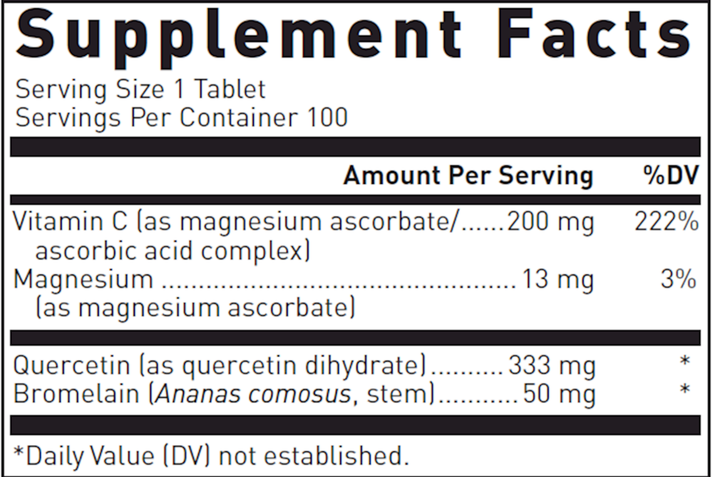 Quercetin-Bromelain Complex is a unique formulation of quercetin, buffered vitamin C, and bromelain. Quercetin is a bioflavonoid that has antioxidant activity to support vascular and immune cell function. Magnesium ascorbate is a buffered form of vitamin C, a key antioxidant, which synergistically supports the quercetin activity. Bromelain is a proteolytic enzyme purified from pineapple.*