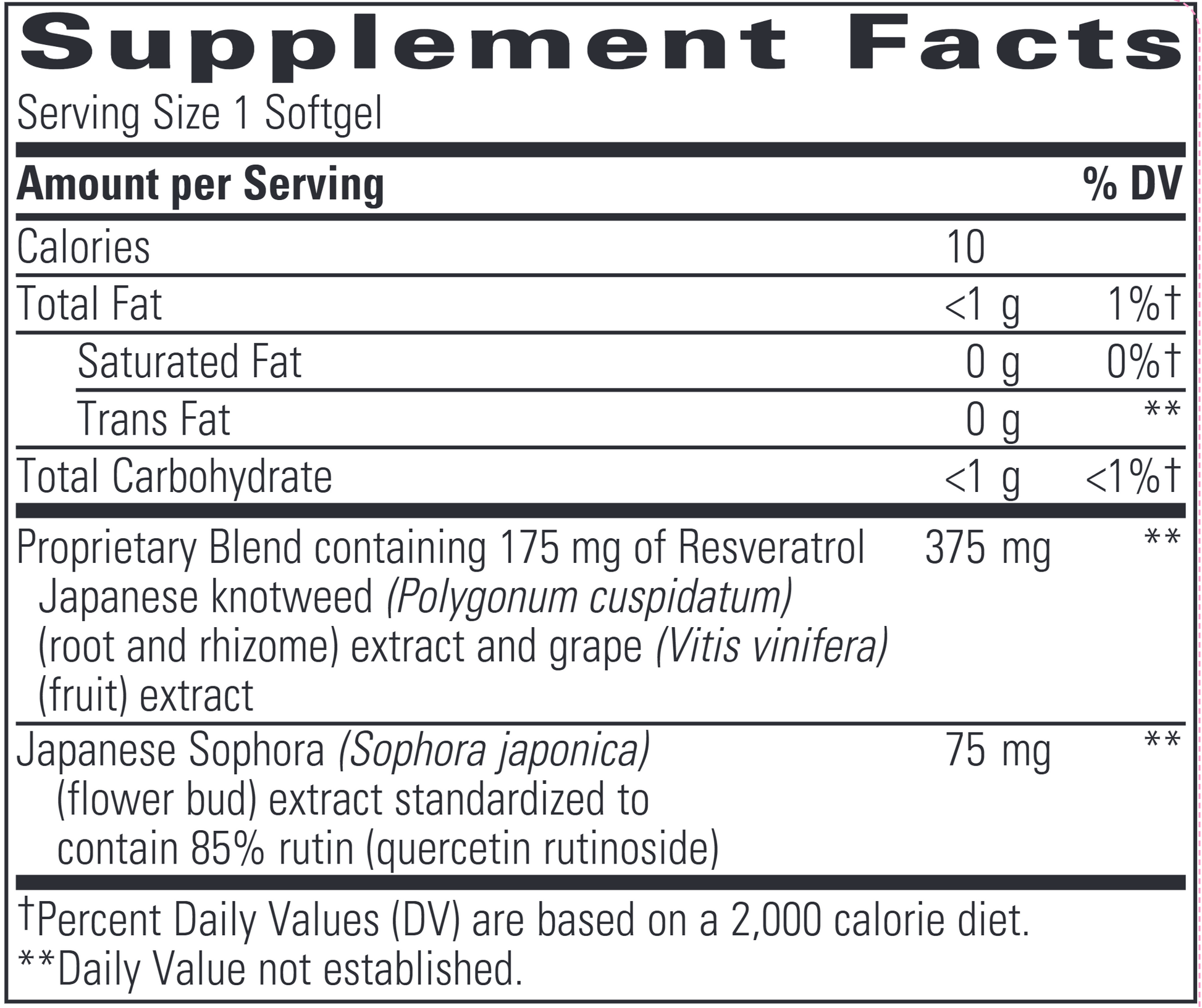 • Once-daily, soy-free softgel• Synergistic combination of resveratrol and rutin