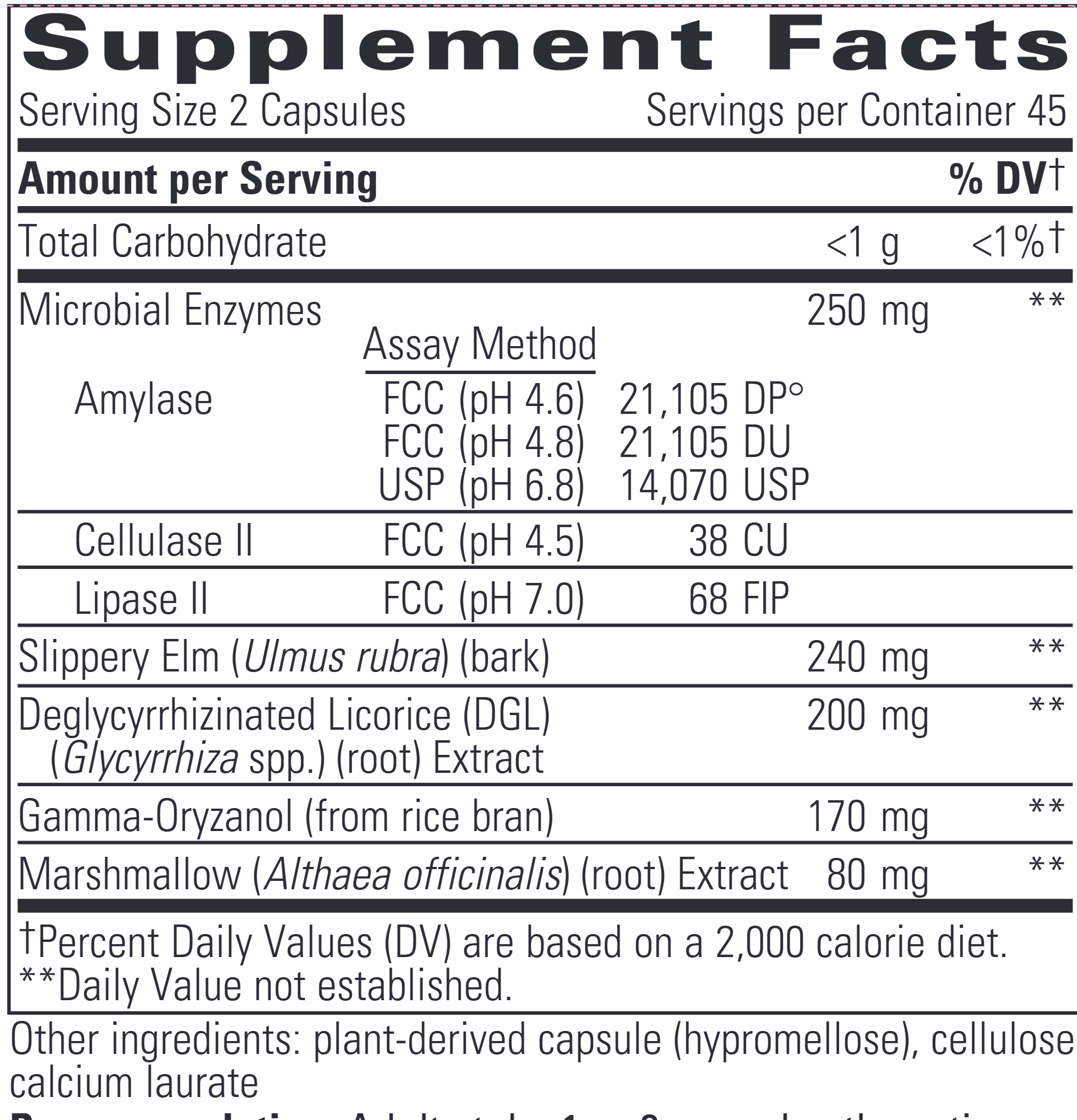 Physician-formulated Similase® Sensitive Stomach combines Microbial Enzymes with marshmallow and slippery elm to provide gentle support for the GI tract.* Gamma-oryzanol and licorice root complement these herbs for soothing gastric mucosa support, and protease is omitted due to its potential for irritation in sensitive patients.*