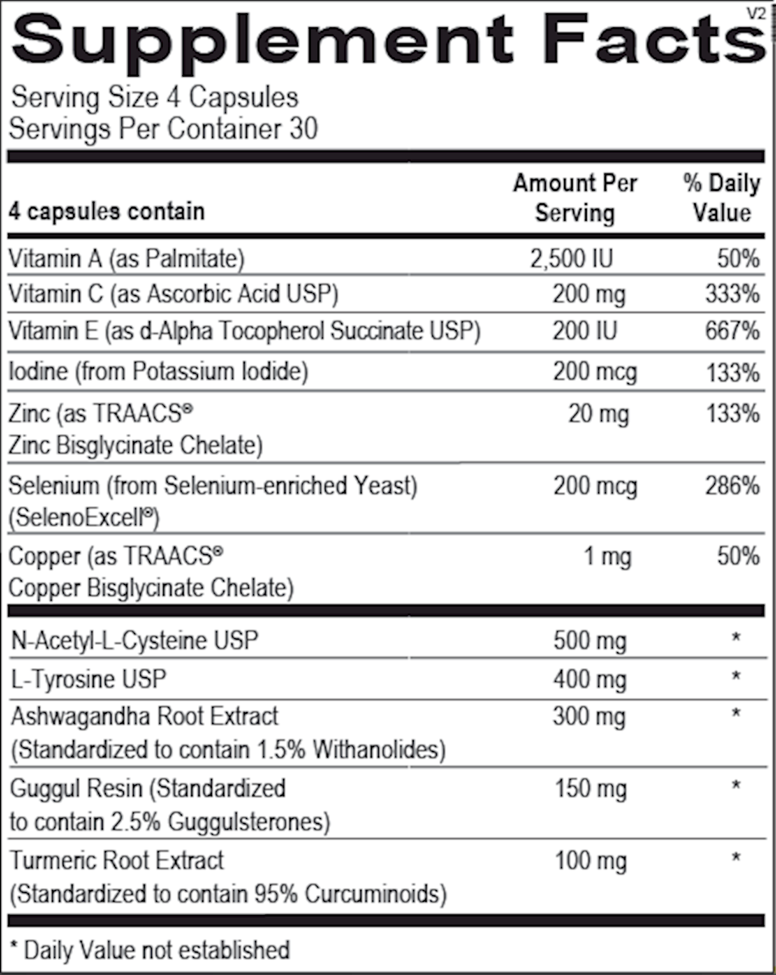 Thyrotain is a comprehensive formulation that provides a blend of nutrients and botanicals working in synergy to support thyroid health. Thyrotain includes L-tyrosine and iodine, which make up the backbone of the thyroid hormones thyroxine (T4) and triiodothyronine (T3). The addition of zinc, selenium, vitamin A, and the botanical guggulipid activate enzymes that enhance the conversion of T4 into the active thyroid hormone T3. Vitamin A and zinc also help improve cellular sensitivity to thyroid hormones. Turmeric, along with the antioxidants vitamin C and E and N-acetyl cysteine (NAC), provide a powerful combination of antioxidants that support thyroid health by reducing free radical stress.